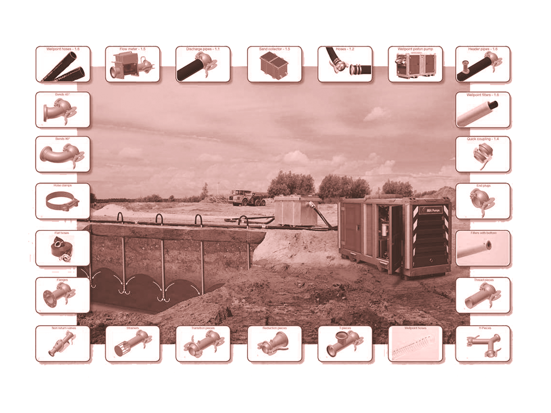 Funcionan en combinación con lanzas perforadas que recogen el agua subterránea y la canalizan hacia la bomba. Este sistema modular permite adaptar la instalación a las condiciones hidrogeológicas de cada obra.